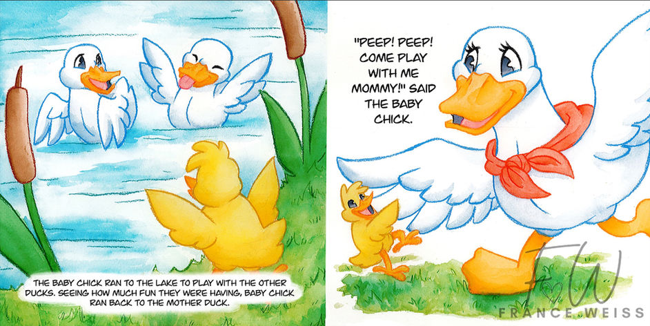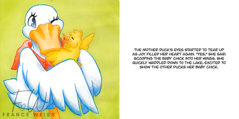 This page is a children's book I wrote, edited, and illustrated as a part of my High School Senior AP Art project. It is a story about adoption and a mother’s bond with her child with a mother duck caring for a baby chick. I wanted to create a simple, fun narrative that introduced the idea of adoptive families to a younger audience.